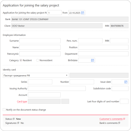 An application for joining the salary project allows you to add an employee who already holds a Bank card to the salary project.