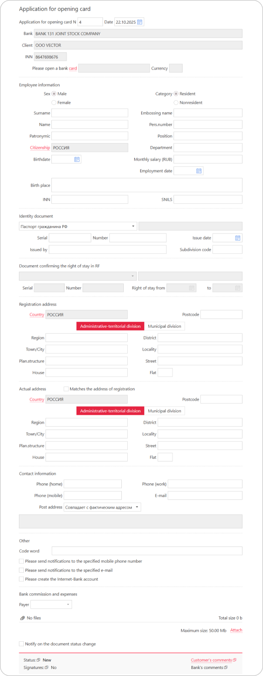 An application for opening a card allows you to issue a new card and enroll an employee in the salary project.