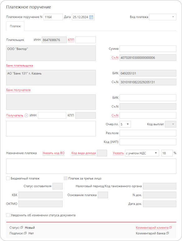 При этом в поле Назначение платежа добавится фраза «НДС не облагается» или рассчитанное от указанной суммы значение НДС. Значение НДС также можно указать в поле вручную. -