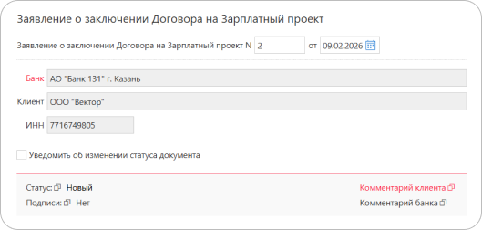 В разделе Заявления → Подключение к Зарплатному проекту нажмите Новый. В открывшейся форме заявления автоматически подставятся необходимые данные. Сохраните и подпишите заявление.