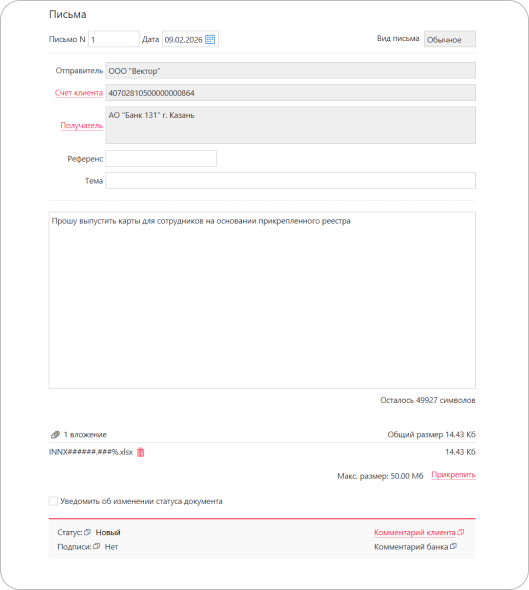 Когда письмо перейдет в статус Исполнен, Банк направит вам реквизиты счетов карт сотрудников. Если при проверке данных реестра возникнут проблемы, письмо перейдет в статус Отвергнут.