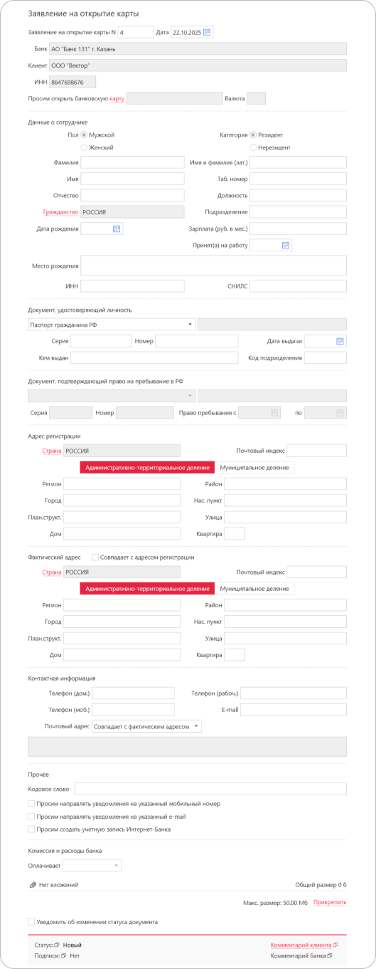 Чтобы создать заявление на выпуск карты вручную, нажмите Создать и заполните открывшуюся форму заявления: